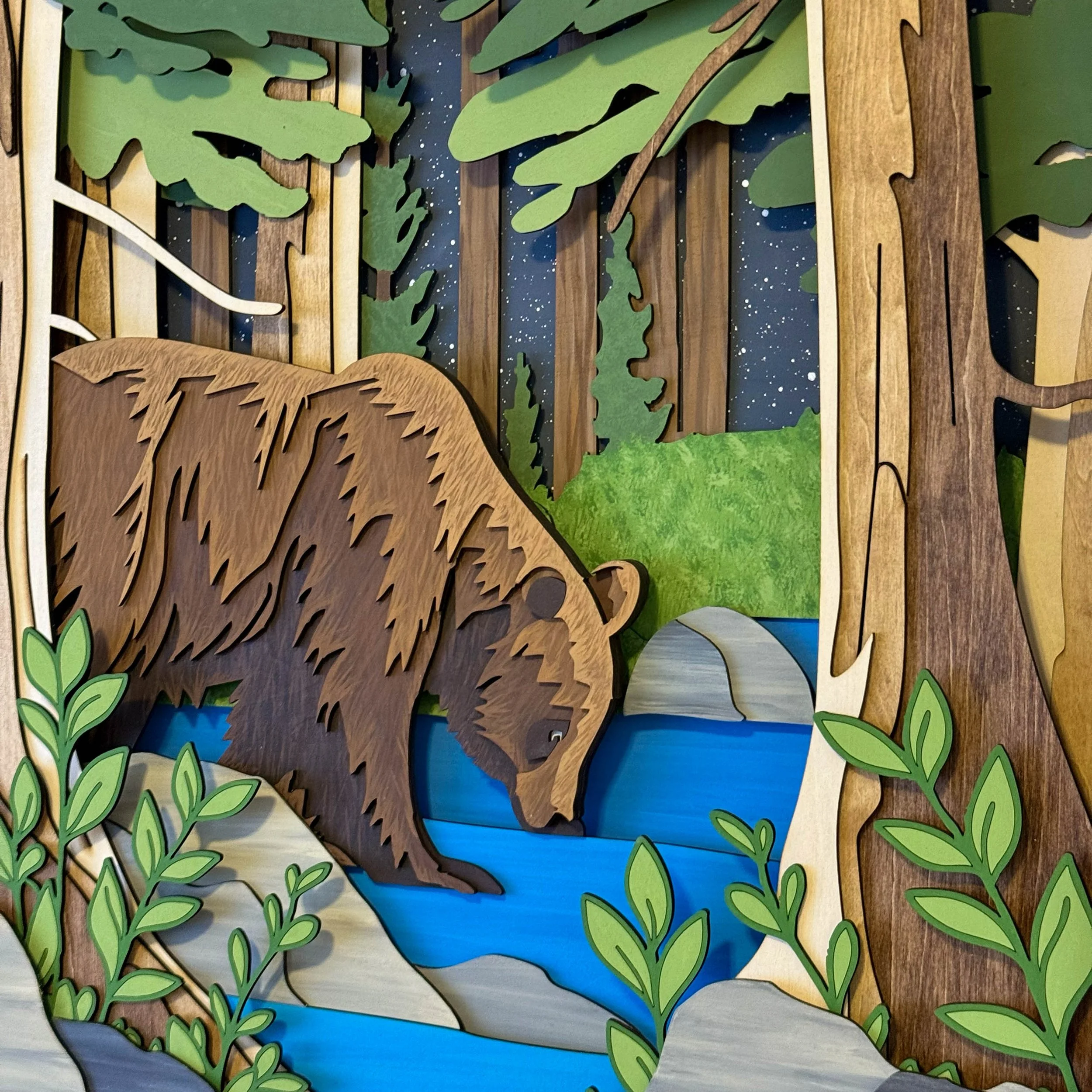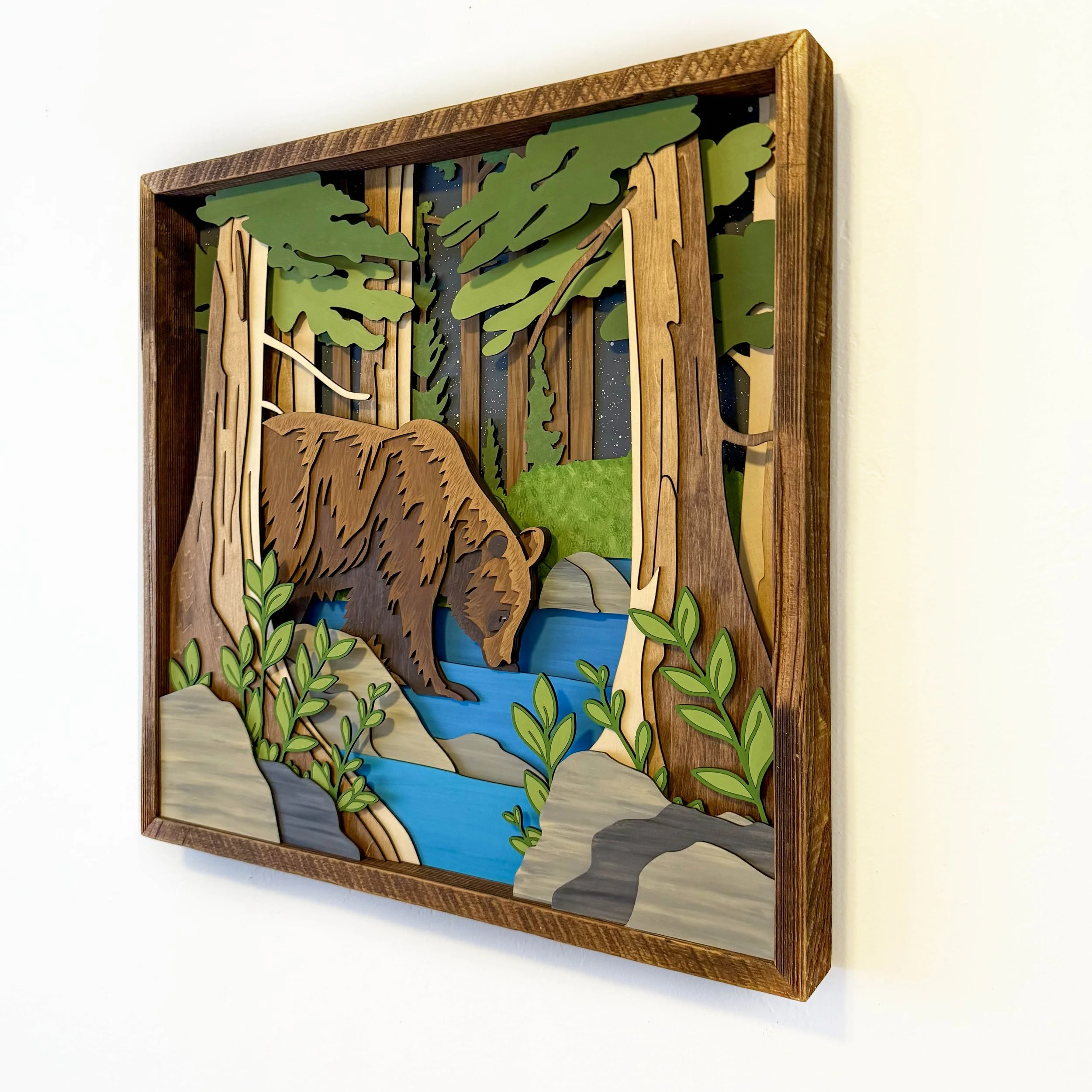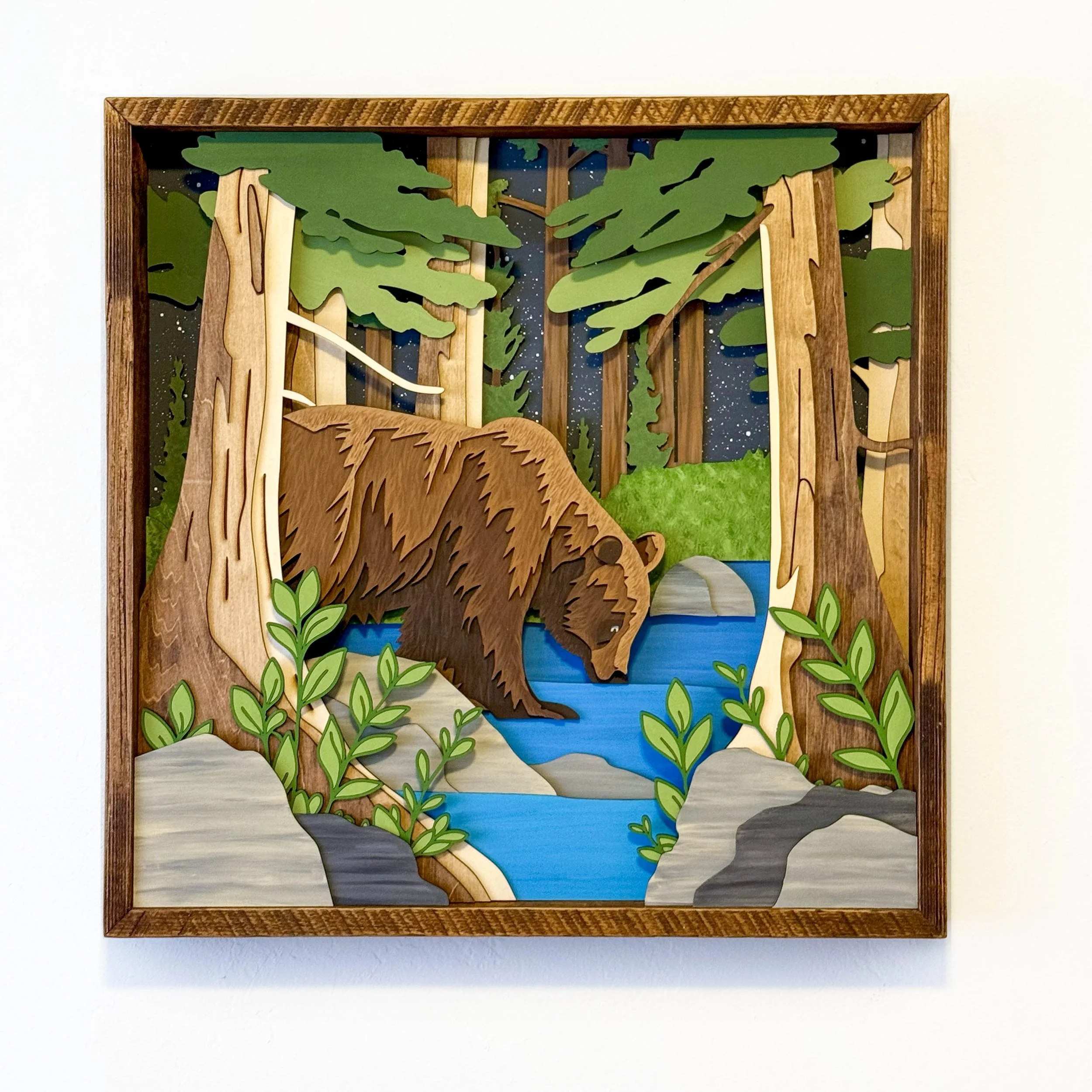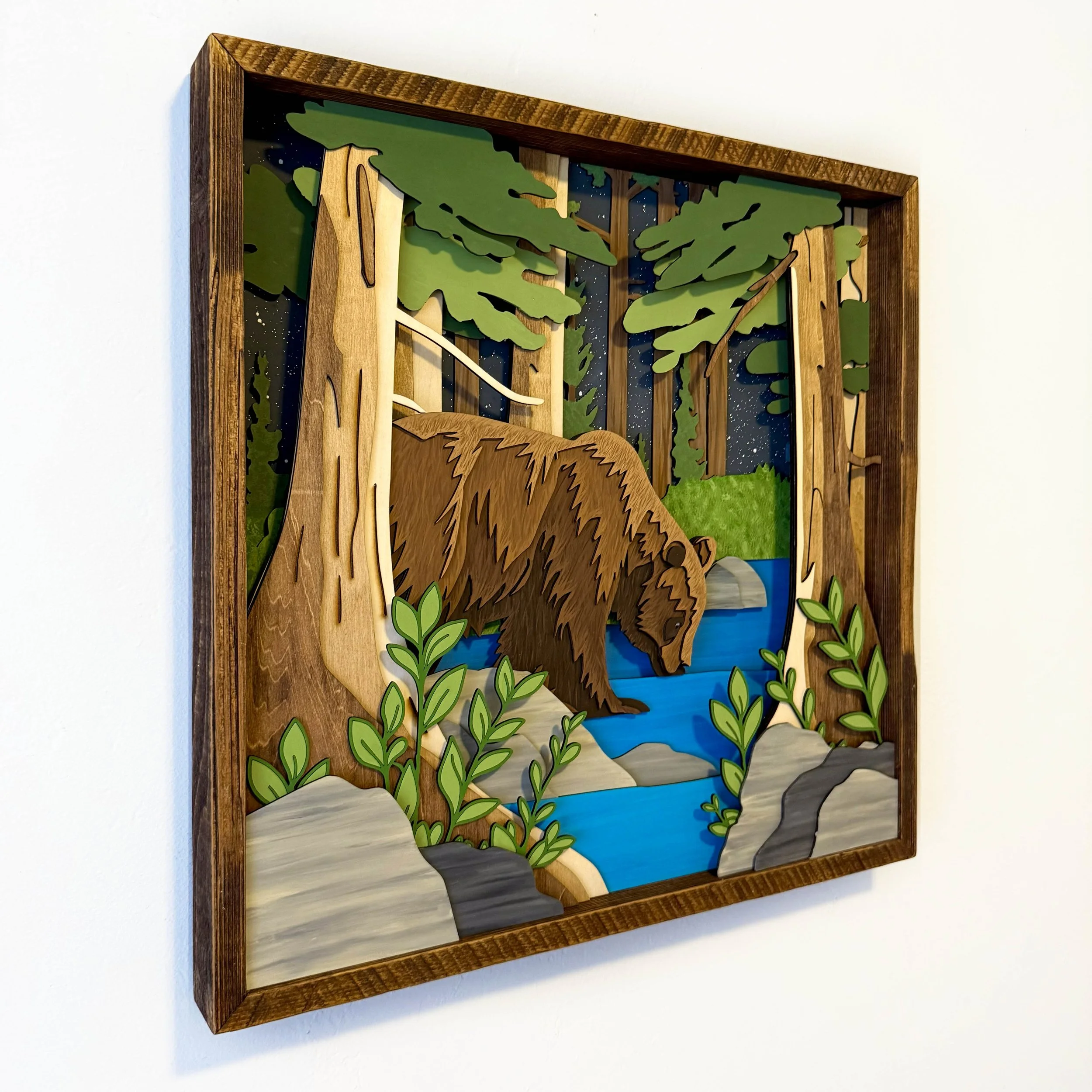 Into the Wild captures a quiet, intimate moment in the forest — a solitary bear pausing at a stream beneath the towering pines and a star-swept sky. Laser-cut from multiple species of plywood and hand-painted in a deep, natural palette, this piece evokes both the majesty and solitude of wildlife in its untouched habitat.